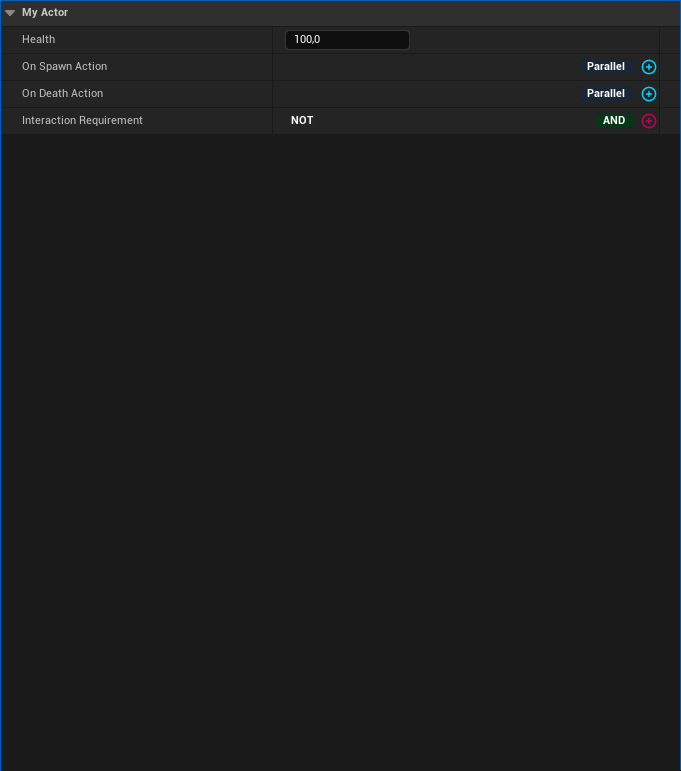 Add FScriptableAction or FScriptableRequirement properties to your classes to instantly expose a logic editor in the Details Panel.